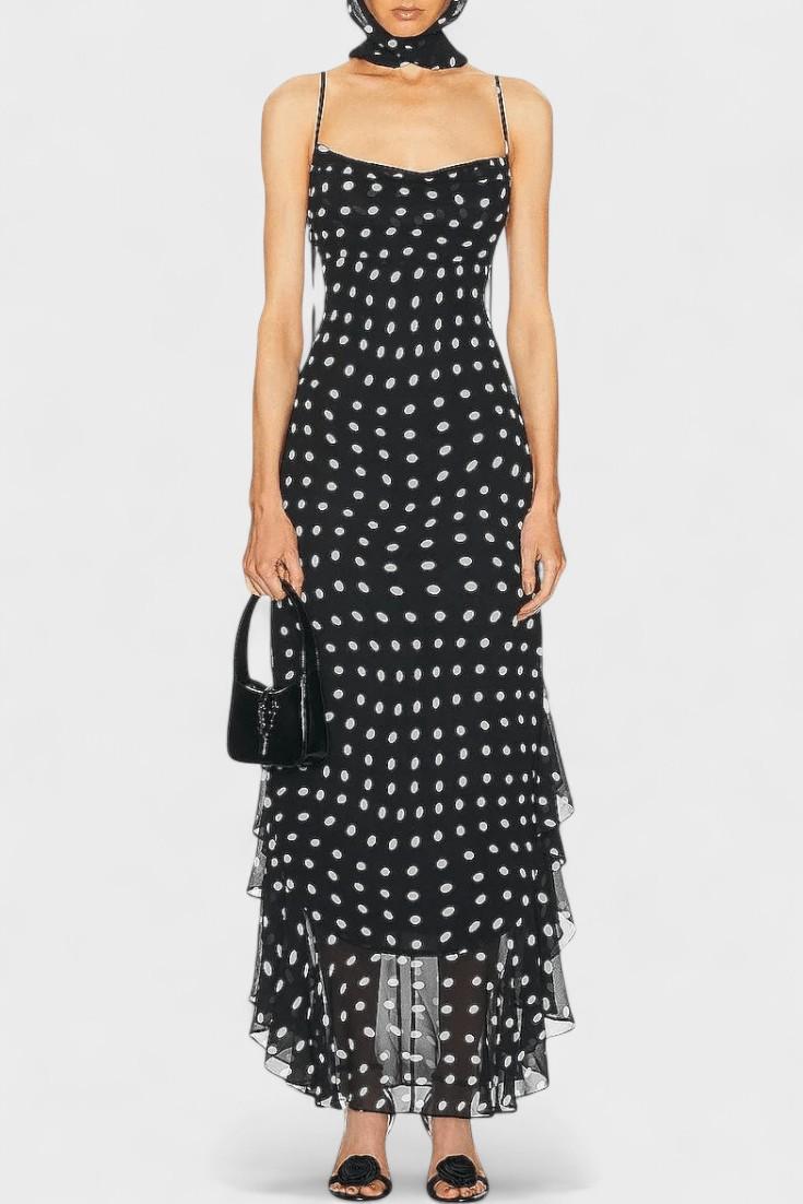Il vestito Estefanía combina classici pois in tonalità crema e nera con delicati volant che aggiungono texture e movimento. Le spalline regolabili e il foulard rimovibile permettono di adattare facilmente lo stile, mentre la zip nascosta sul retro mantiene la silhouette pulita ed elegante.