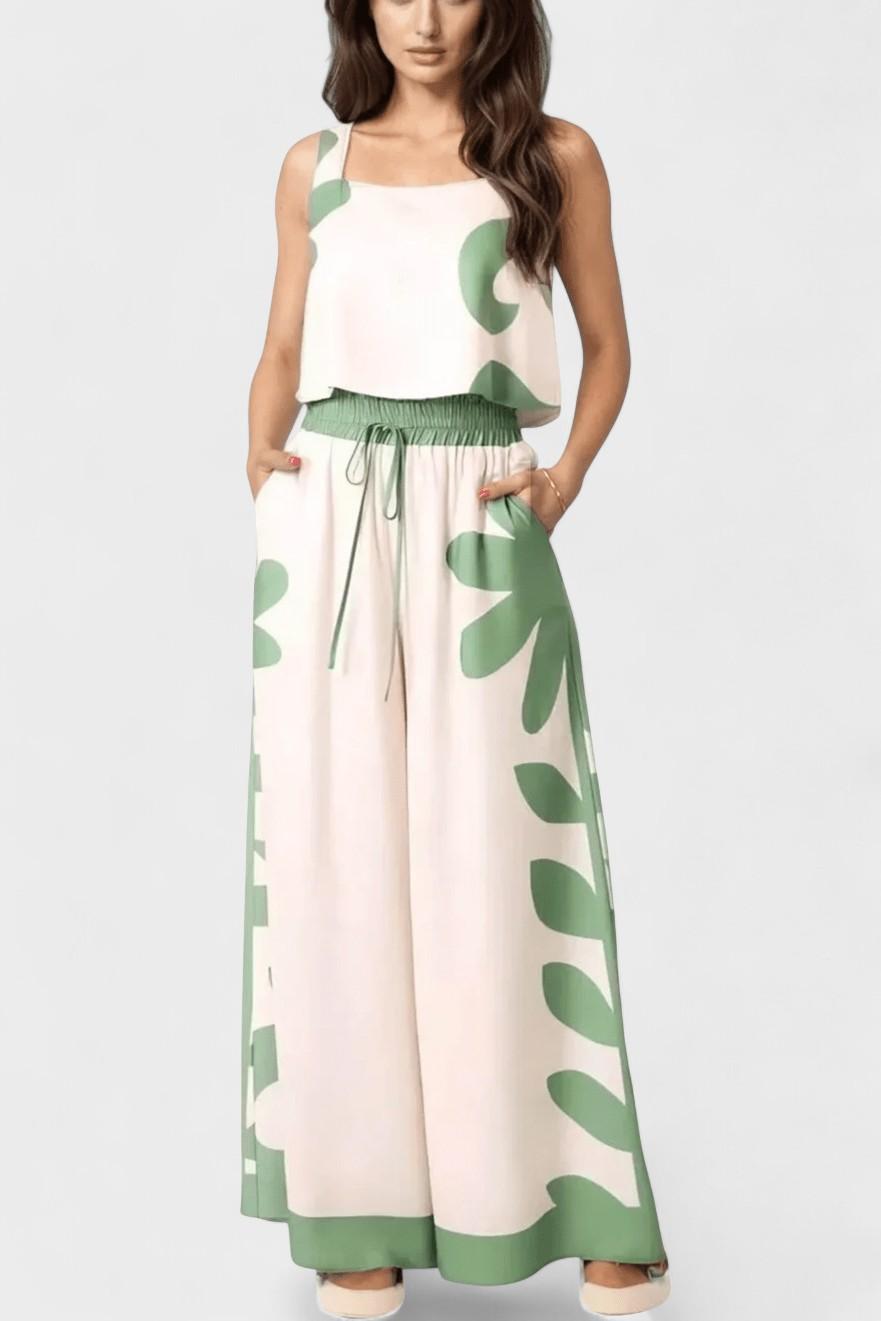 Entra nel mondo dell'eleganza spensierata con il set Serafina – questo completo rilassato ma sofisticato è progettato per la libertà e il movimento. Il top senza spalline e i pantaloni larghi rendono questo outfit a due pezzi una scelta leggera e traspirante. La sofisticata stampa floreale ispirata al folklore crea un'atmosfera vintage-romantica, catturando il fascino dei giorni di sole e dei momenti tranquilli ed eleganti.